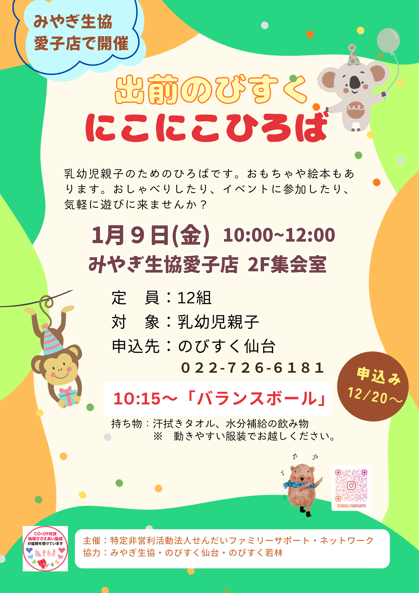 「出前のびすく にこにこひろば」は、乳幼児親子のためのひろばです。