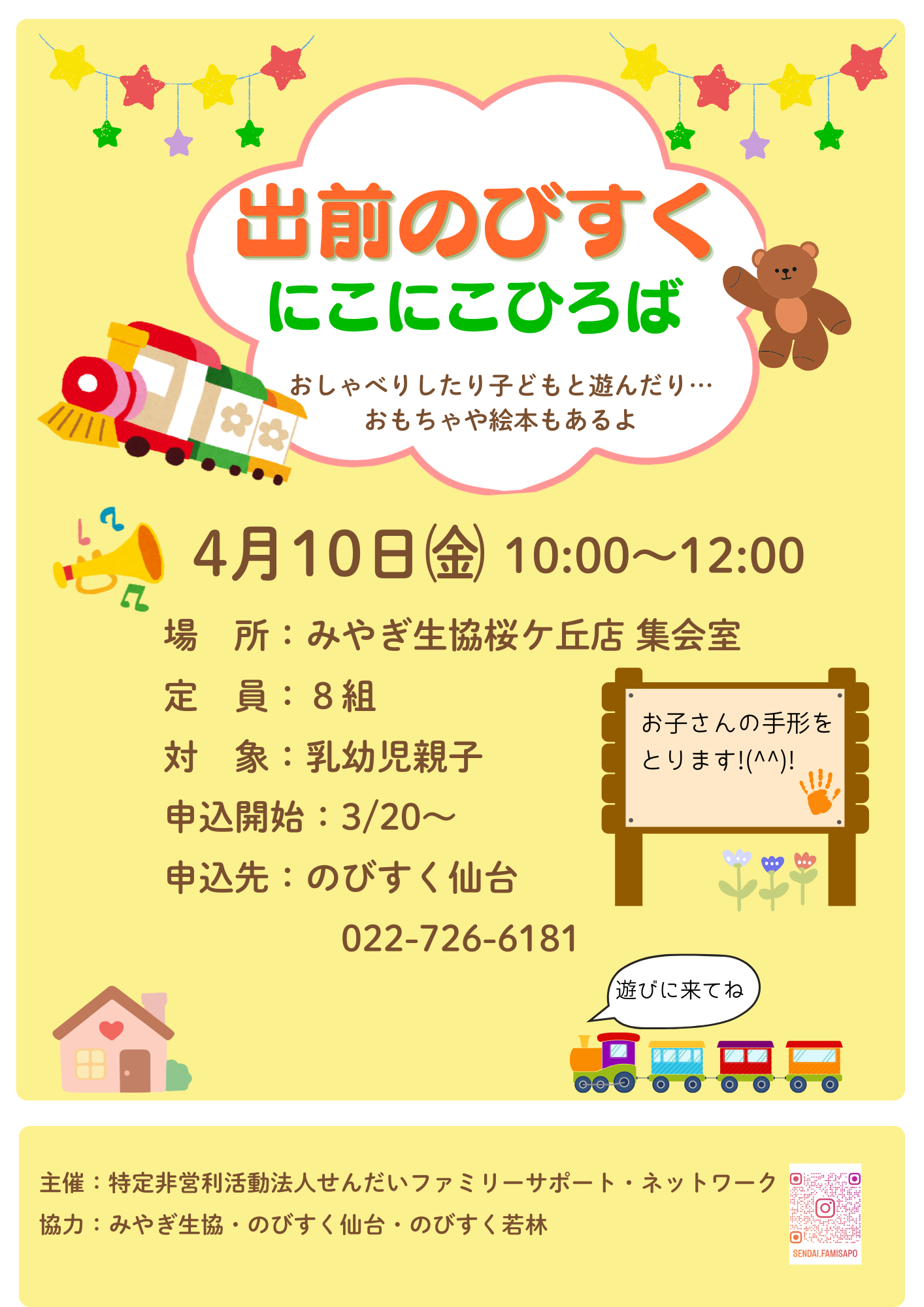 日 時:4月10日(金)10:00~12:00 ※申込受付中場 所:みやぎ生協桜ケ丘店 集会室対 象:乳幼児親子定 員:8組